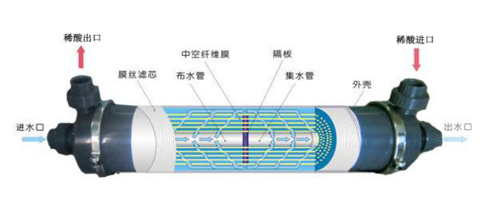 (一).膜法氨氣回收技術(shù):廢水中的氨氮在水中存在離解平衡,當(dāng)提升廢水的PH值時(shí),廢水中的氮氮即分解為氣態(tài)氨直至達(dá)到平衡。同時(shí)經(jīng)PH值提升的廢水進(jìn)入氨氮分離膜,氣態(tài)氨會(huì)透過疏水性中空纖維膜的微孔與膜外側(cè)的吸收液發(fā)生反應(yīng),由此又一次會(huì)分解廢水中的氨氮直到氣態(tài)氨達(dá)到平衡,即呂.查德里(A.L.LE Chatelier)原理:在自然界中一切平衡都是相對(duì)的與暫時(shí)的,一但改變平衡系統(tǒng)的條件之一,平衡就向參減弱這個(gè)改變的方向移動(dòng)。